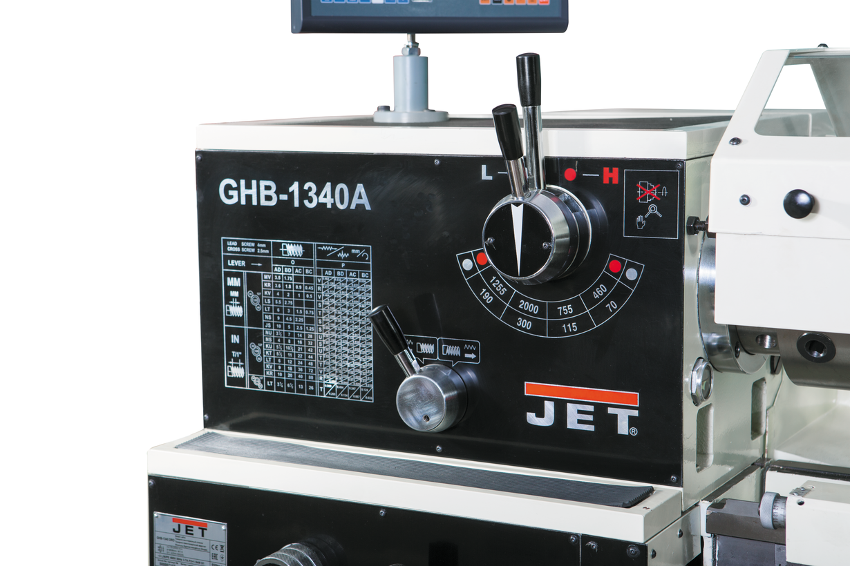 GHB-1340A DRO выполнен по двухвинтовой схеме. Для нарезания резьбы используется ходовой винт, для автоматического точения - ходовой вал. На станке возможна регулировка зазоров направляющих при помощи клиновых планок, конструкция задней бабки позволяет обтачивать конические заготовки. Для облегчения механического переключения режимов на GHB-1340A DRO применяется толчковый (импульсный) режим пуска двигателя.